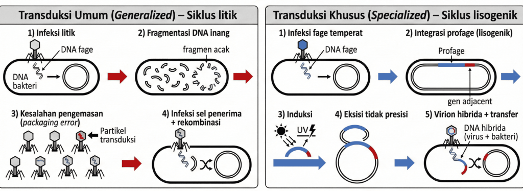 Transduksi terjadi ketika bakteriofage (virus penyerang bakteri) secara tidak sengaja menjadi kendaraan pengangkut gen bakteri, bukan gen virus. Proses ini terbagi menjadi dua tipe berdasarkan siklus hidup virusnya: