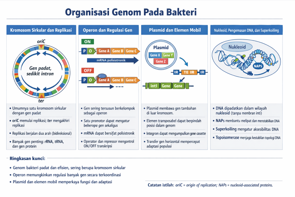 Genom bakteri (seperti E. coli) terdiri dari sekitar 4,6 juta pasang basa. Jika direntangkan, panjangnya sekitar 1.000 kali panjang sel itu sendiri. Agar muat di dalam nukleoid tanpa membran, bakteri menggunakan strategi pengemasan tingkat tinggi.