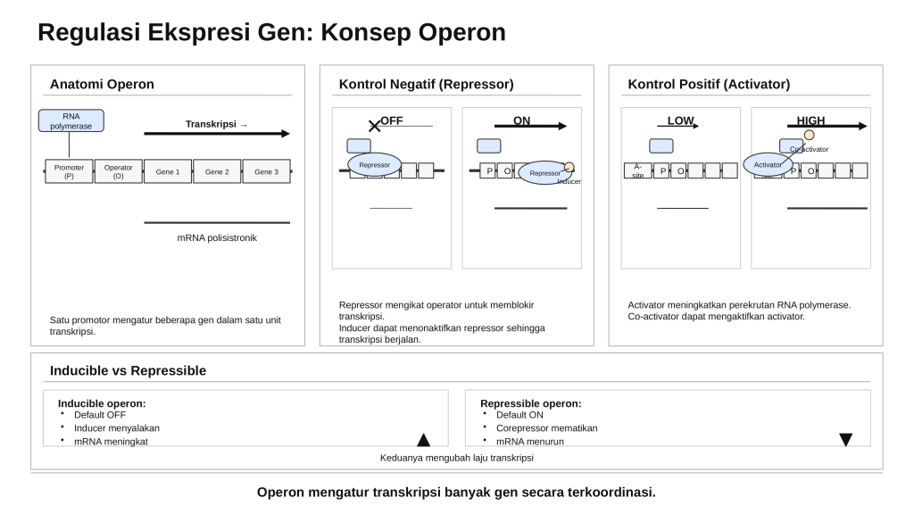 Ini adalah contoh klasik efisiensi genetik. Operon ini terdiri dari sekelompok gen yang mengkode enzim pemecah laktosa. Sistem ini memiliki “sakelar” otomatis: