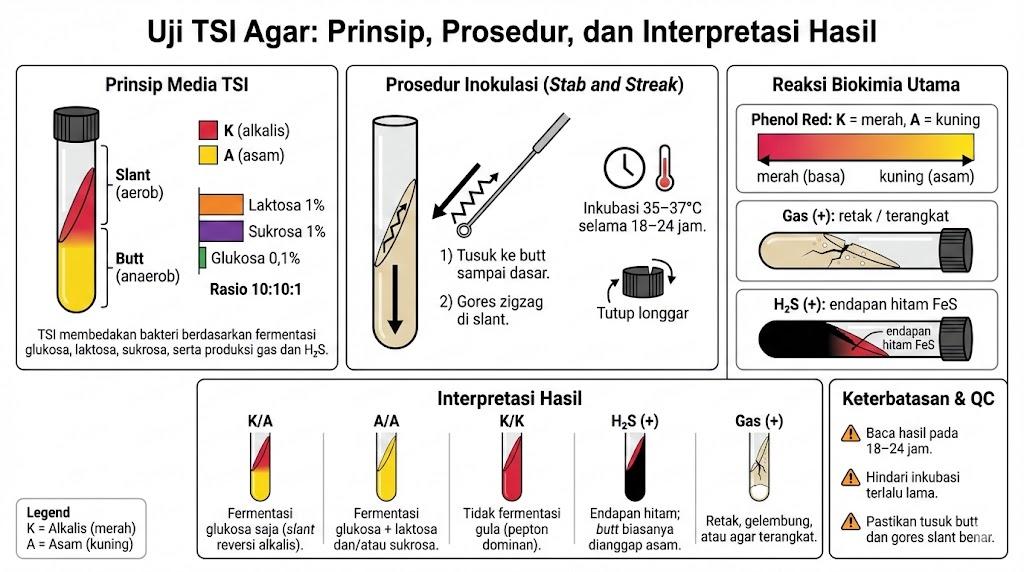 Uji TSI Agar merupakan metode yang efisien dan informatif untuk karakterisasi awal bakteri Gram-negatif. Dengan memahami prinsip biokimia di balik setiap perubahan warna dan endapan, praktikan dapat mengidentifikasi genus bakteri secara presumtif sebelum dilanjutkan dengan uji serologi atau molekuler lebih lanjut.